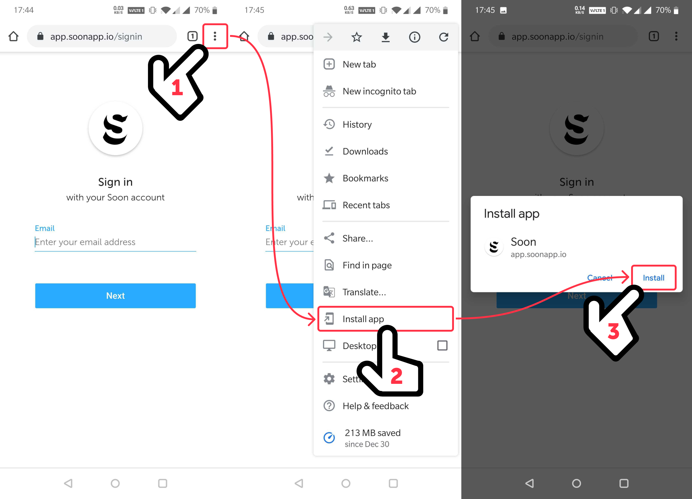On Android, you are automatically prompted if you want to install Soon on your phone. By confirming the message, the app is directly installed and added to your Home Screen. If you decline this message, you will still be able to install Soon at any time by tapping on ⋮ more options, selecting Install app, and confirming the installation by tapping Install. Soon will show up on your home screen like a native Android app.