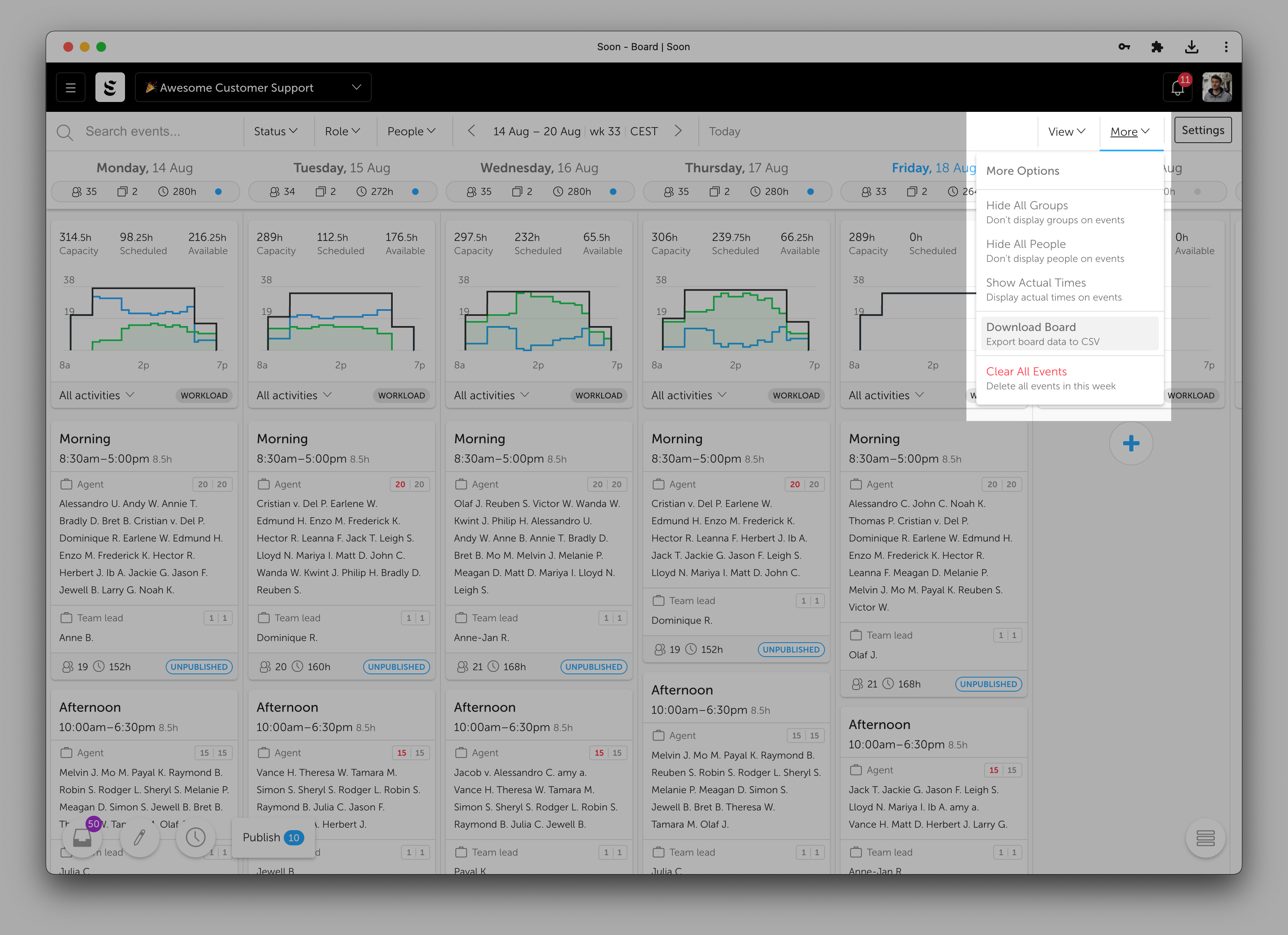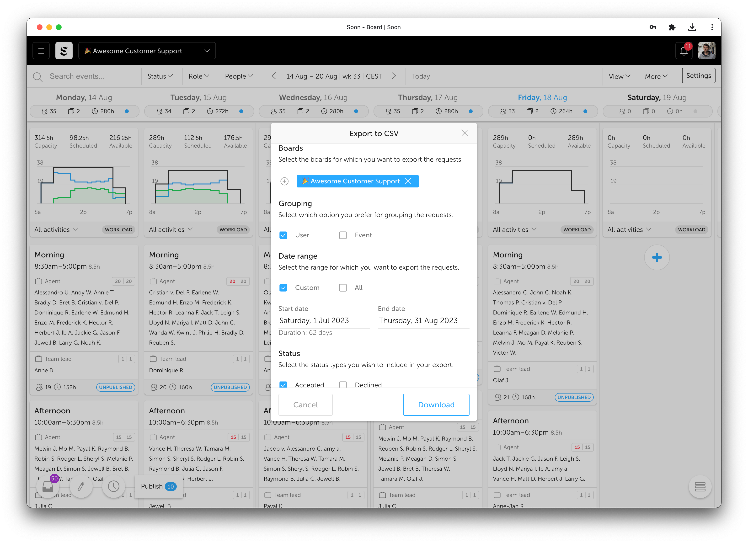 Easily download your board's event data in the universally recognized CSV format, compatible with leading spreadsheet software like Excel, Numbers, and Sheets.