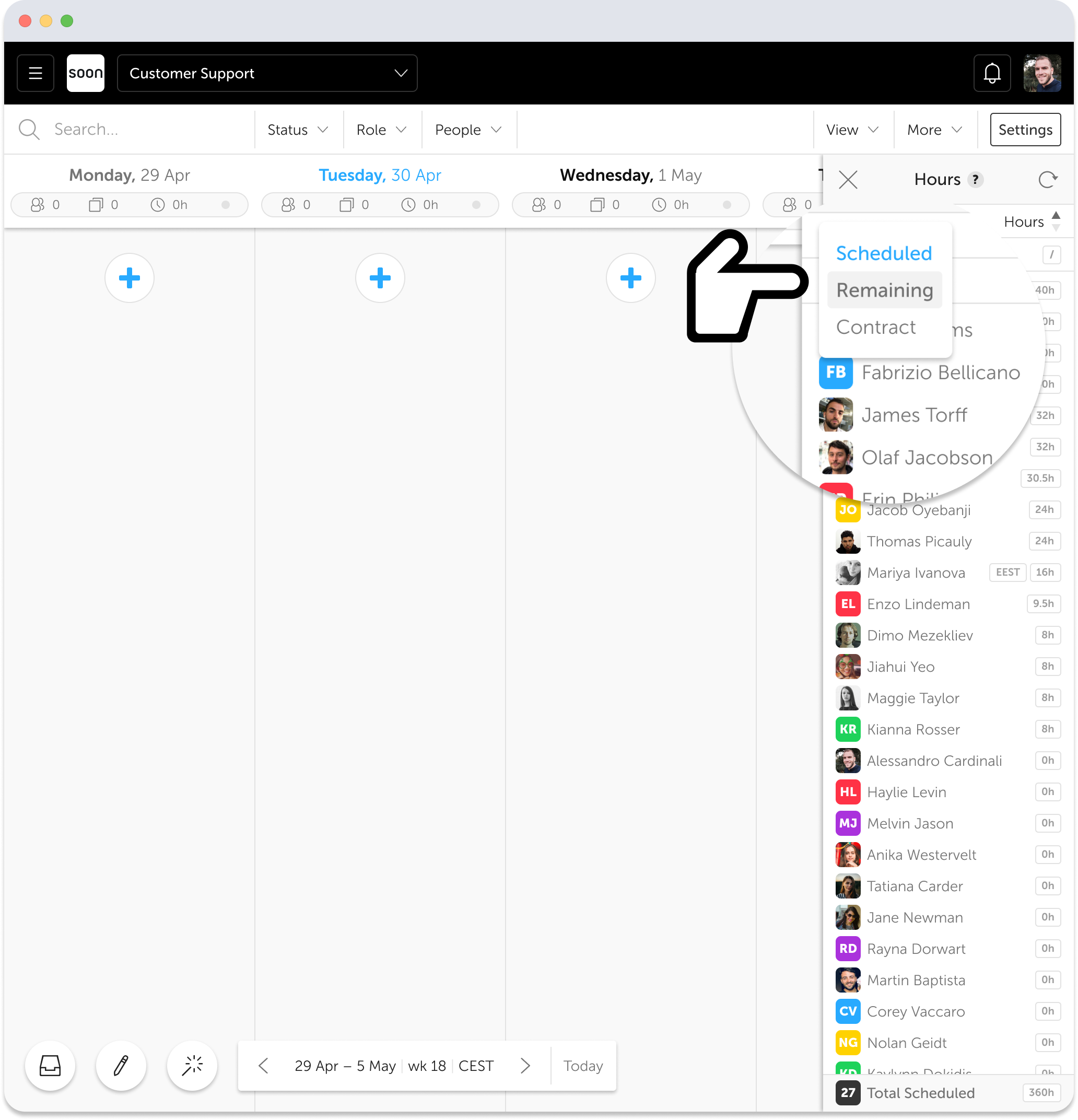 The panel offers three key types of insights for analysis: Scheduled, Remaining, and Contract hours. Choose the desired type from the options available at the top left of the modal.