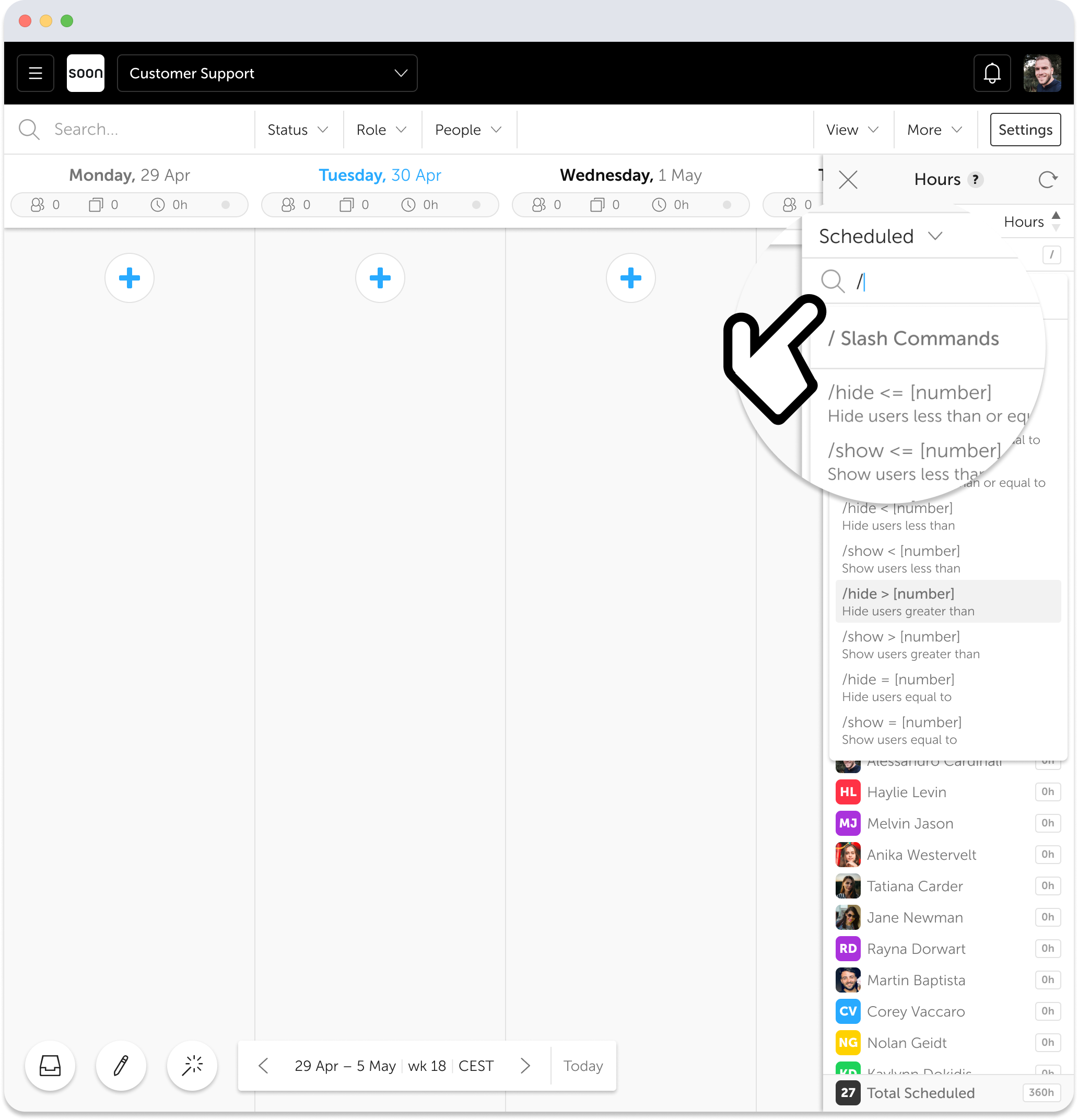 A powerful way to view specific users of interest is by using Slash Commands to apply filters. For example, if you wish to identify users who require additional scheduling to meet their contract hours, select "Remaining" from the list and enter the command /show > 0 in the search field. It's important to note that totals displayed at the bottom of the hours overview are based on what is currently filtered and visible.